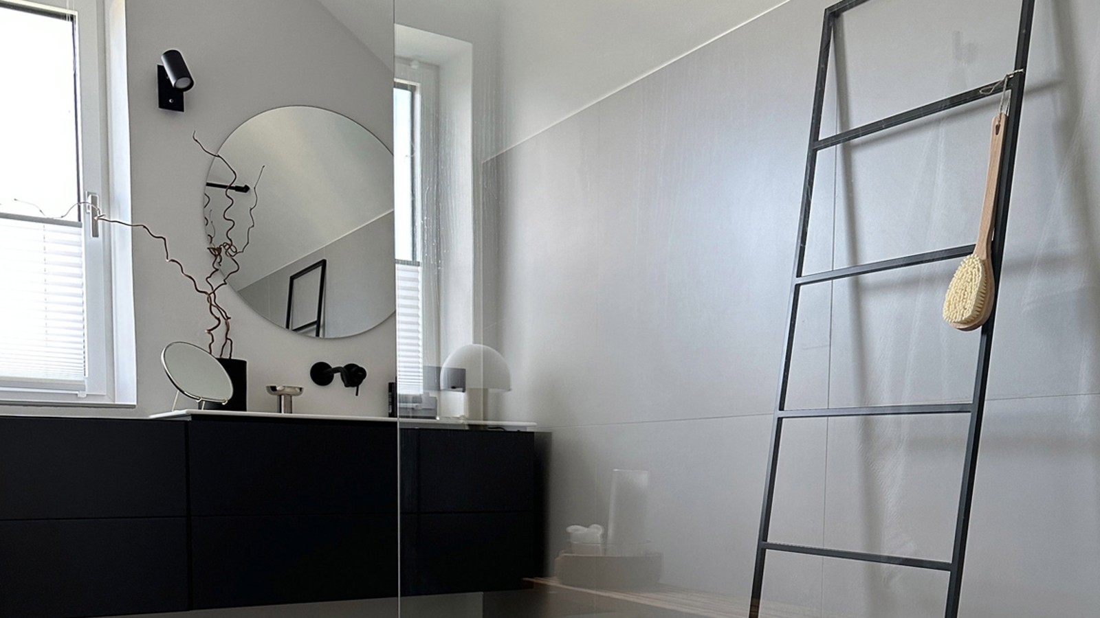 Ein runder Spiegel über dem Waschtisch fügt sich gut unter der Dachschräge ein, schwarze Armaturen ergänzen den klaren, modernen Look.